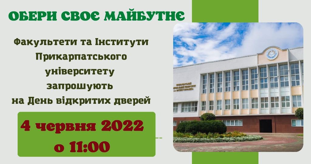 4 червня, в суботу, об 11 год Прикарпатський запрошує майбутніх абітурієнтів та їхніх батьків завітати до Університету та взяти участь у проєкті «Обери своє майбутнє». У межах проєкту на всіх факультетах та в інститутах відбудеться День відкритих дверей. На Вас чекають: Читати далі